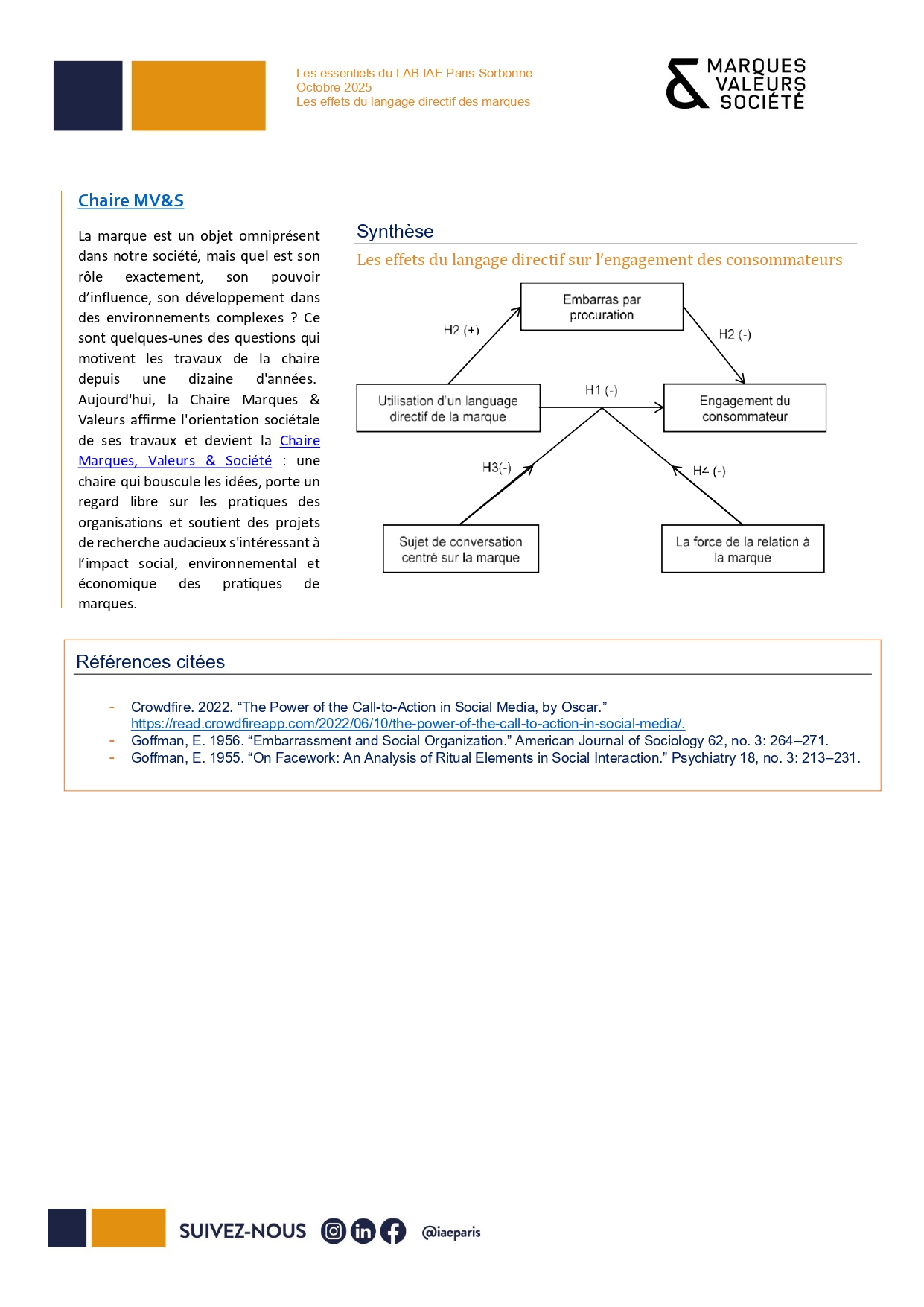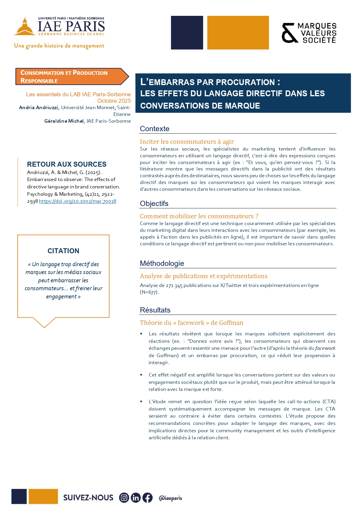 Avec les essentiels du LAB, nous souhaitons vous partager régulièrement les résultats de recherche scientifique du LAB IAE Paris-Sorbonne. Au programme pour cette édition : “L'embarras par procuration : les effets du langage directif dans les conversations de marque” par Géraldine Michel, Professeure à l'IAE Paris-Sorbonne et Andria Andriuzzi, Maître de conférences à l'université Jean Monnet Saint-Etienne dans le cadre de la Chaire Marques, Valeurs & Société.